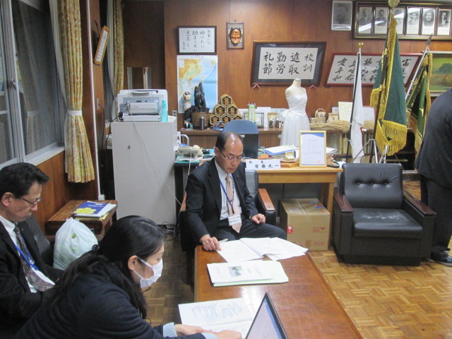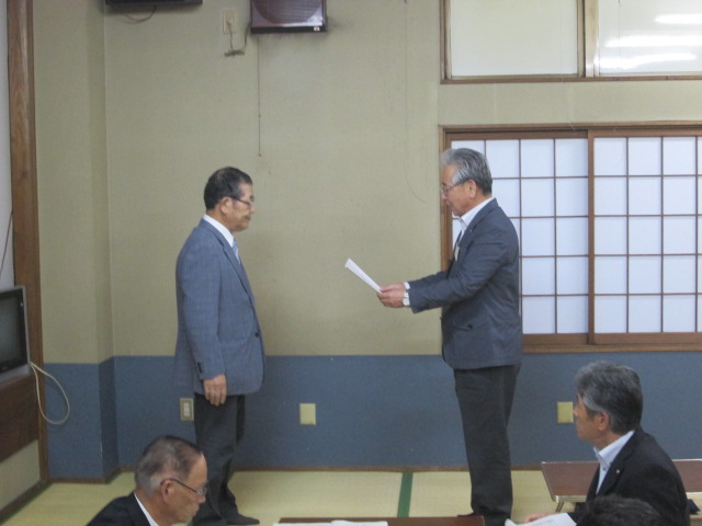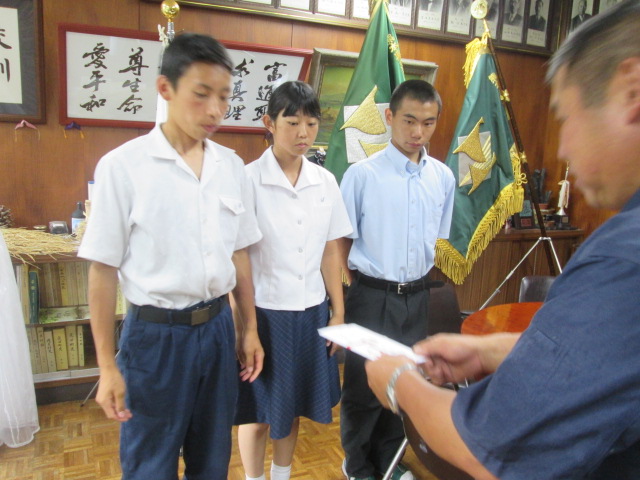 体育館では、鶴田会長から、鬼塚さんへ代表して渡していただき、式終了後、丸尾先生からそれぞれに交付しました。
