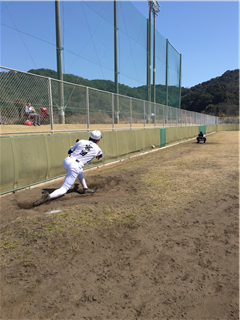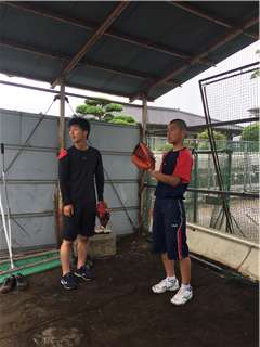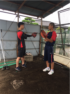 多良木高校出身で法政大学3年の中村浩人君が捕手の指導をしてくれました。さすが一流プレーヤーだけあって、指導もレベルの高いものでした。
