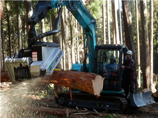プロセッサで丸太を切り、造材します。初めての操作に緊張気味です。