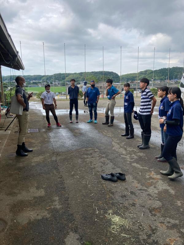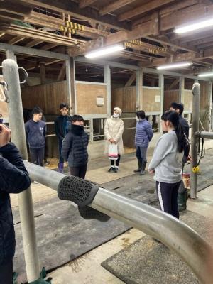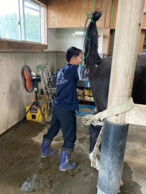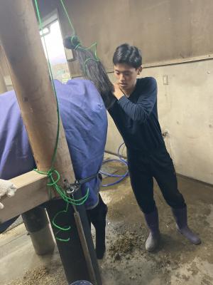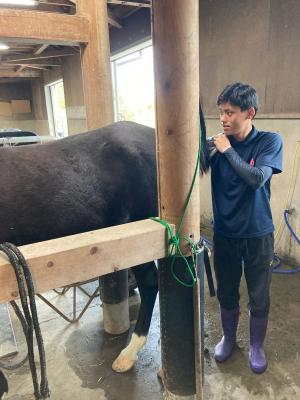 枠場を整理し、馬の直腸検査を行いながら少しずつ人工授精ができるように馬を慣らしていきます。部員が実際に直腸検査を行います。