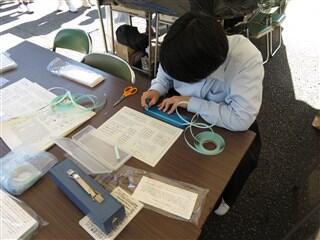 点字体験コーナーでは、点字板とタックテープを用意し、来場者の皆さんにはタックテープに御自分の氏名を点字で打っていただいたものを持ち帰っていただきました。ここ人吉球磨地域にも視覚障がいにより点字を使ってコミュニケーションをとっている方がおられます。本校には福祉に関心がある生徒が多くいますので、現在学んでいる点字を通して視覚障がいのある方とも交流をしたいと考えています。