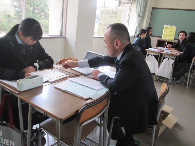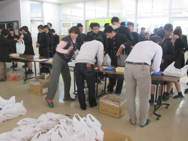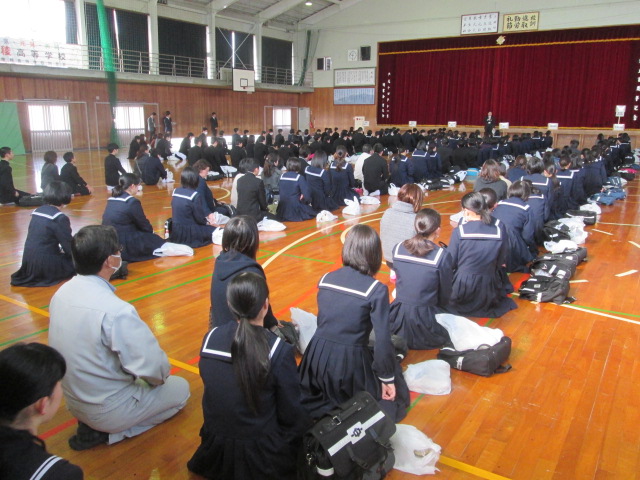 その後、9:30~12:00まで、体育館でスリッパ、グラウンドシューズ、体育館シューズ、実習服、長靴の採寸や、芸術教科選択科目(音楽、書道)調査書を配布を行いました。