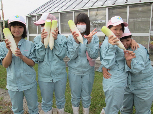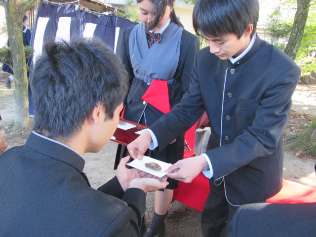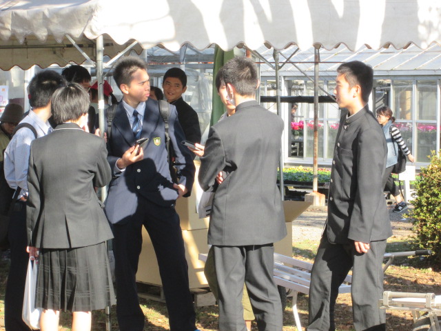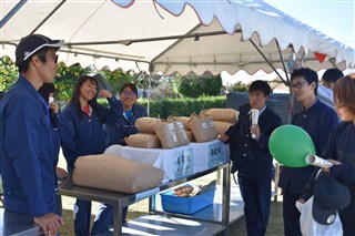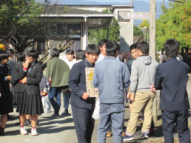 本日、本校のグラウンドで収穫感謝祭を行いました。日頃の学習成果としての農産物の収穫に感謝し、生徒・職員が一同に会して喜びを分かち合うとともに、幾人かの保護者の方も交えて一層の親睦を深め合いました。体育館でのセレモニーでは、生産科学科・永田さん、園芸科学科・平川さん、環境工学科・植木君、食品科学科・永田さん、生活経営科・吉村さん、普通科総合コース・高橋君、らが代表であいさつ。祭壇には収穫したものをお祭りしています。