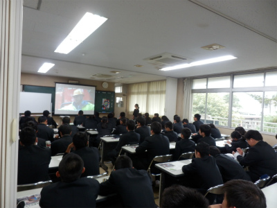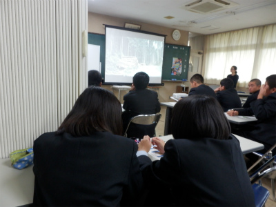 次に、総合農業科1年生(76人)に林業の入門編として、森林の機能や意義、仕事や人吉市の林業の歴史を学びました。