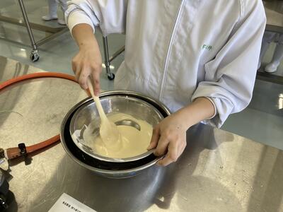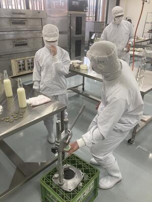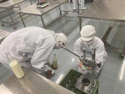 持ち帰り用のふうきゃん製造実習を行いました温度管理や香料の配合など王冠の打栓など自分たちで全工程を行いました