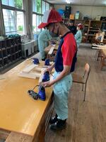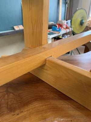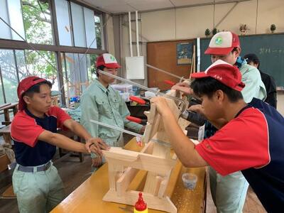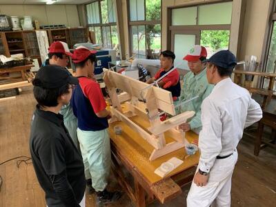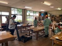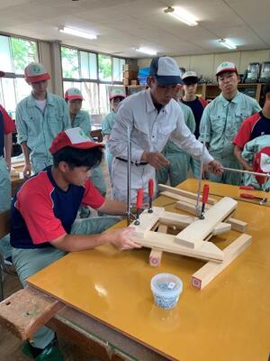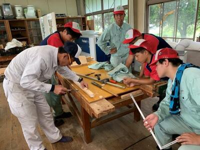 2年生は、現在、ベンチを製作しています。その中で過去の製品を見て、木の組み方でもっと改善できるのではという意見が出ました。早速、部材に墨付けをして、ノコとノミで加工していきます。実習の先生の技で部材に切り込みができ、見事、でっぱりがなくなりました。匠の技ですね!!!
