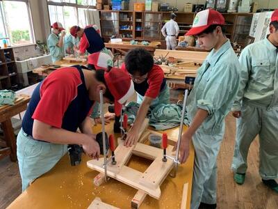 環境コース2年生は、南稜祭に向けて木製ベンチを製作しています。これまでは部材を一度木工ボンドで接着していたのですが、ボンドが固まるまで1週間待たなければなりませんでした。そこで時間短縮のためにクランプという器具で止めながら木ネジを打っています。どうにかうまくいったようです。