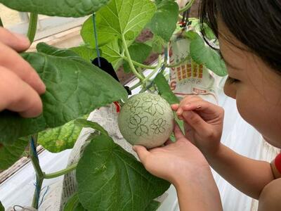 ある日、アールスメロンの温室に入ってみると、メロンに落書きをしているじゃないですか!!!。いえいえ、これは実験です。中学生の皆さんは、アールスメロンのネットがどうやってできるか知っていますか?(調べてみましょう♪)なんと、この傷がそのままメロンのネットになるのです。どうなるのか楽しみですね♪