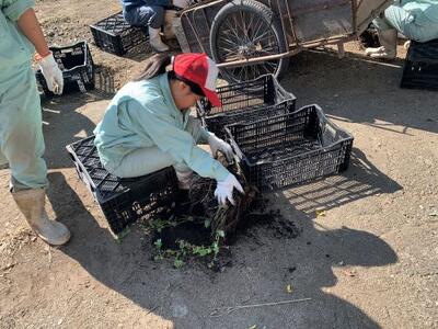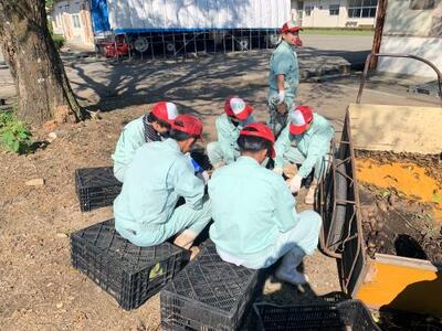 2年生の植物コースは、里芋の収穫をしていました。猛暑で成長が心配されていましたが、無事、収穫することができました。ただ、収穫後は、一つひとつイモを取り出し洗います。そのあと袋詰めです。販売するまで気は抜けません。みんな一生懸命頑張っていました。
