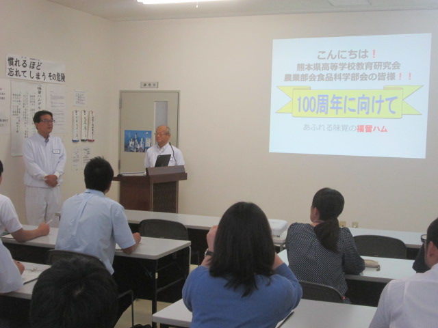 8月18日(金)食品科学部会が行われ、午前中は菊池農業高校で、「熊本県におけるHACCP基本的説明」について、熊本県健康福祉部健康危機管理課奥田様から講義と、食品製造実習室での自主点検を行っていただきました。午後は、福留ハム株式会社熊本工場で、HACCPの研修と工場見学を行い、HACCPに関する理論と実践を学びました。