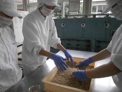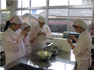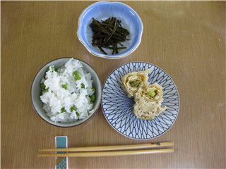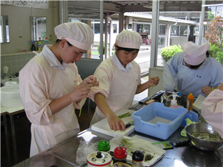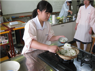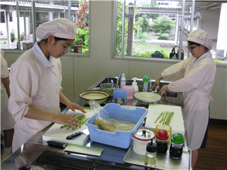 本日の3,4時間目は、生活経営科3年生の「郷土料理」の授業で「グリンピースご飯・ふきの信田巻き、きゃらぶき」を