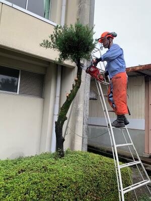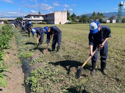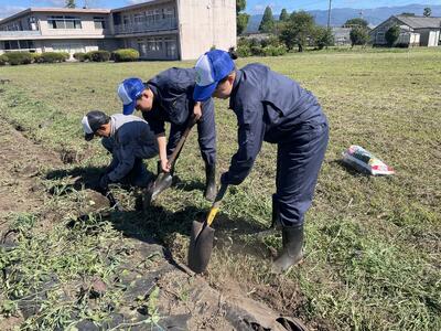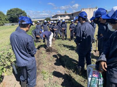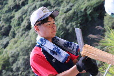校内には、様々な木がありますが、イヌマキという木は、手入れに手間がかかるため、環境整備ができていない状態でした。そこで3年生の林業専攻生がチェーンソーで細かく伐採し、1年生で片付けました。この木は今後、チップにして肥料にしていくそうです。学校環境を整備してくれています。