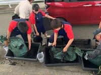 トレイの中に竹炭と牡蠣殻を砕いたものとフルボ酸(中学生の皆さん調べてみてください♪)を混ぜ込んでいきます。これは川にとって、水質浄化、水性プランクトンの栄養となります!!