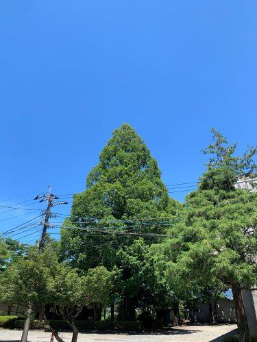 青空も夏らしくなってきました。写真は、校内にある樹高30mはあるメタセコイアです!