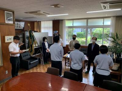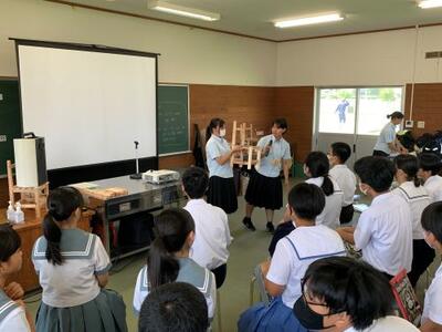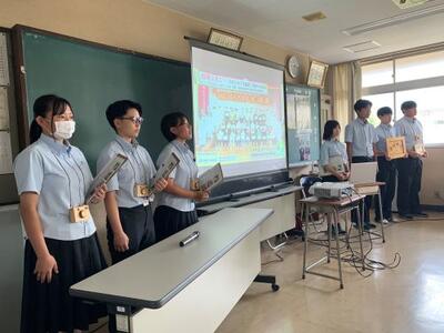 プロジェクト発表の井上さん(多良木中)、濱﨑さん(錦中)