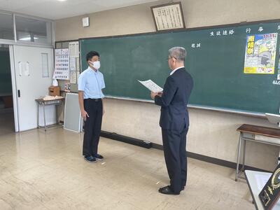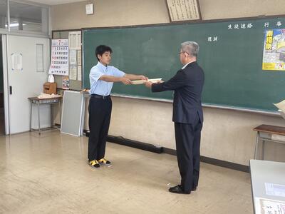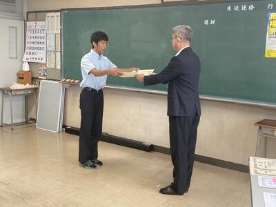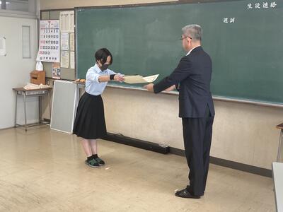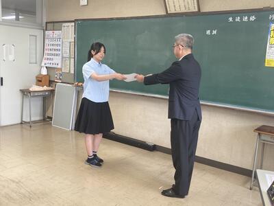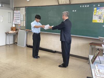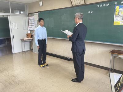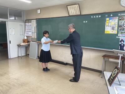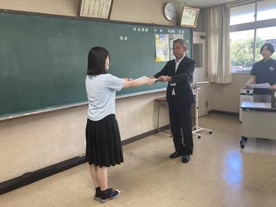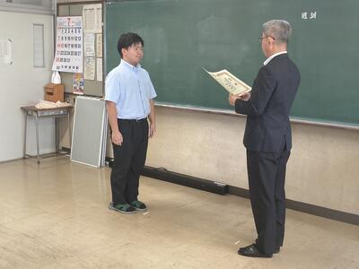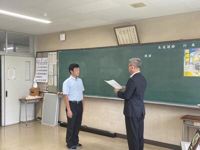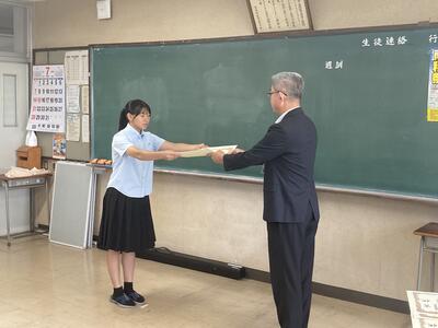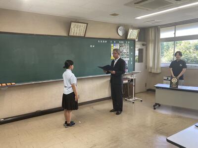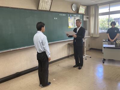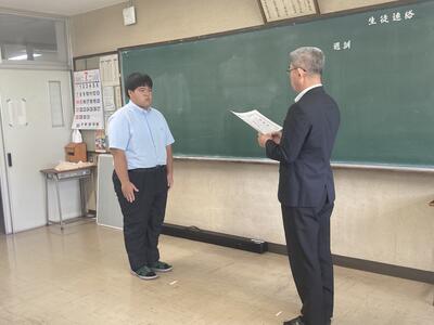 先月28日に始業式の予定でしたが台風で休校となり昨日行いました。体育館の暑さも考慮し、今回も各教室内で中継をしながらの始業式でした。始業式の前には表彰式が行われました中継ではありましたがが、表彰の際には各クラスから大きな拍手が聞こえたり、校長先生のお話も真剣に聞いていました。