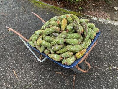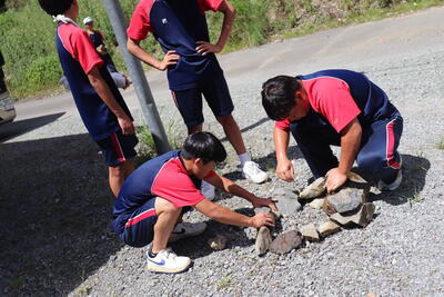 2学期のスタートの予定でしたが、台風10号の接近により、学校は休校となりました。台風が去った後、先生方で施設設備の確認をしました。校内にある大王松(ダイオウマツ)の木の周りには、たくさんの松ぼっくりが落ちていました。驚くべきはその大きさ(20cmはあります!)です。これはネイチャークラフトの材料になります。