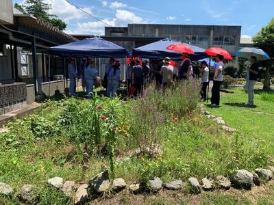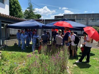 環境コースでは、令和2年7月豪雨災害後、東京大学や熊本県立大学、旅行会社とともに流域治水についてのスタディツアー(中学生の皆さん調べてみてくださいね♪)を計画しています。森林や田んぼダム、雨庭などの力で自然災害を減らすことができることを観光客に伝えるのです。この日も多数の参加者に雨庭の重要性を伝えました。