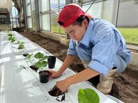 植物コースの野菜専攻では、南稜祭に向けての栽培を開始しました。夏休みの間、種子から育てた苗を定植したのです。まだまだ暑いハウスの中ですが、3年生は進路活動と両立させながら頑張っています。おいしいメロンができるのが楽しみです。南稜祭で販売しますので、しばしお待ちくださいね。