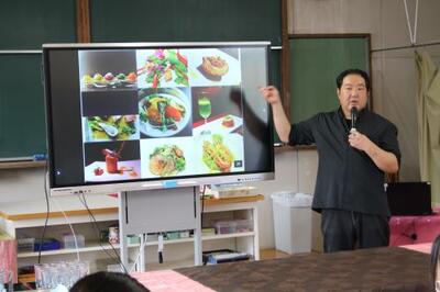 生活経営科2年生は、あさぎり町の協力で、『あさぎり町の収穫祭』を行いました。これは地元の農産物の魅力を再発見するもので、熊本市内にあるイタリア料理店、antica locanda MIYAMOTO のオーナーシェフである宮本健真さんの講話がありました。