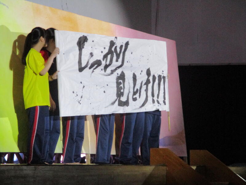 そして、ついにその時を迎えました。幕が開いたステージでスポットライトと観客の視線がステージ上に注がれ緊張も最高潮に達したなかで、まずは部員の思いが込められた「しっかり見とけ!!!」の文字が登場し…