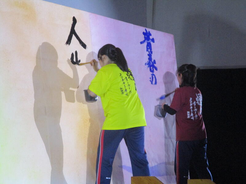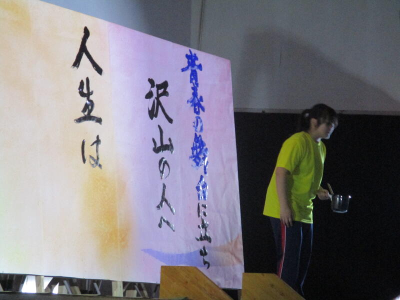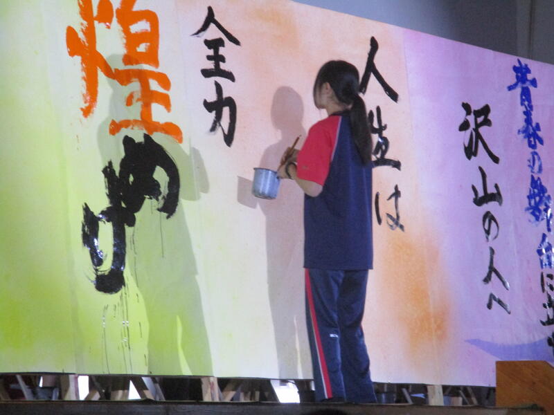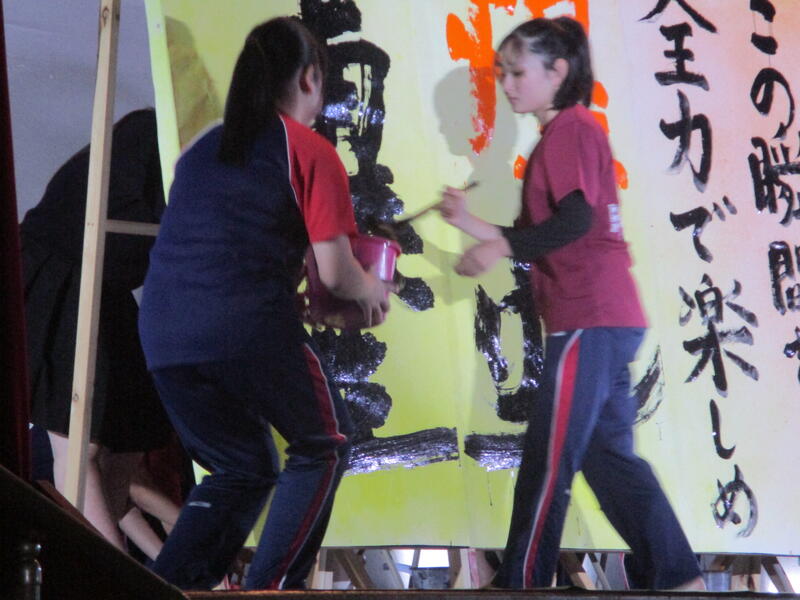 そして、大きな文字で「煌めけ 南稜生」という書道部のメッセージを書き上げました。これには、生徒一人ひとりがこの「南稜祭」という青春の時間をとおして、生徒同士や来場された方々に笑顔を届けられる場にしたいという想いをこの文字に託しました。最後に部長の吉村さんより今回の作品に対する思いを発表し、無事に練習どおりのパフォーマンスをごらんに入れることができました。