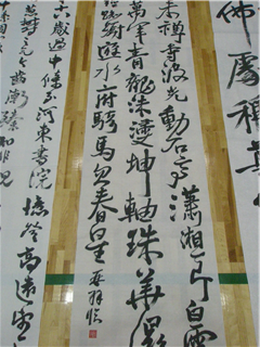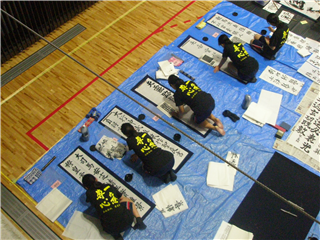 【書道部】第24回県高等学校書道揮毫大会に出場しました! 投稿日時 : 2018/09/08 投稿者6 9月8日(土)に宇土市民体育館で開催された県書道揮毫大会に南稜高校書道部員6名が出場しました。2年総合農業科2組島田さん、1年総合農業科2組谷口さん、1年食品科学科田中さん、福永さん、1年生活経営科石原さん、城山さん の 6名。当日は県下高校の書道部員342名が揃い、体育館の中は日頃の練習の成果を十二分に発揮せんばかりにと熱気に満ちあふれていました。本校書道部員もこの日のために夏休みを通じて精一杯練習を重ねてきました。そして、揮毫開始直前まで顧問の西田先生の指導を受けて筆を運んでいました。また、この日を迎えるにあたり作成した書道部Tシャツも一同に揃い、気持ちを一つに高めていきます。開会式終了後、揮毫開始です。制限時間2時間のうちに作品を仕上げなければならないとあって、会場内に書道部員の緊張が伝わってくる独特の雰囲気の中で作品に取り組んでいました。揮毫終了後、各学年・部門ごとにフロアに並べられ、参加者全員でそれぞれの作品を鑑賞しました。この中で本校書道部も全員力のこもった作品を作り上げることができました。←総合農業科2年島田さんの作品(2尺×8尺の大作です。)大会に参加して部員一同大いに緊張しましたが、貴重な体験をすることができて充実した時間を過ごすことができました。これからも書技の向上を目指し、今まで以上に部員一同頑張っていく決意を新たにしました。今後は高校書道展や11月の南稜祭に向けて更に練習を重ねていくことになります。これからも書道部への応援よろしくお願いします!