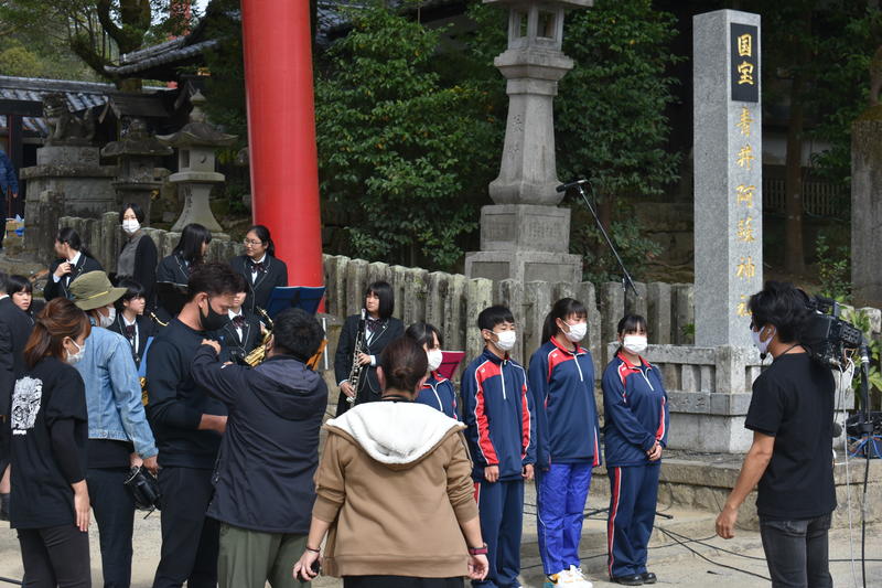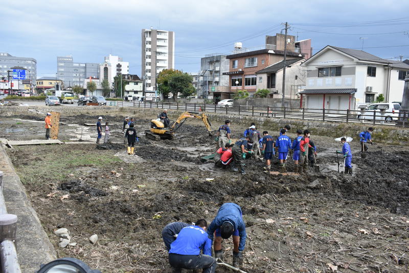 この日は午前11時過ぎにパフォーマンスを披露する青井阿蘇神社の楼門前に到着しました。本校吹奏楽部のメンバーも機材の搬入など慌ただしく準備するなか、前日から当日にかけて人吉高校・球磨工業カヌー部をはじめとするボランティアの方々による蓮池の清掃作業が行なわれていました。