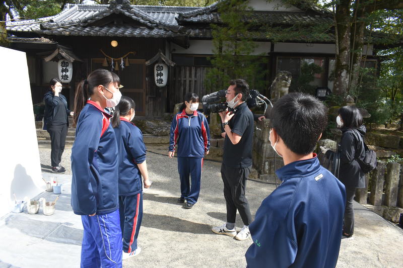 そして、午後2時20分過ぎパフォーマンス本番の時間となり、その様子が生中継されました。南稜高校書道部が本校吹奏楽部の生演奏に合わせて、今回7月豪雨災害で被災された人吉球磨地域の方々に寄り添い、少しでも励みにしていただければと願いながら書き上げていきました。