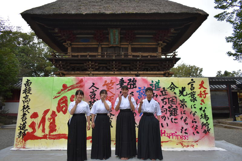 このパフォーマンスに向けて、南稜高校書道部から被災された方々へ届けたいメッセージをみんなで出し合い、考えながら作り上げていきました。「人吉球磨の被災された方々に元気を届けたい」という思いを胸に、今回の豪雨災害で被災された方々の一日でも早い復興を願う気持ちを「前進」の文字に込めました。