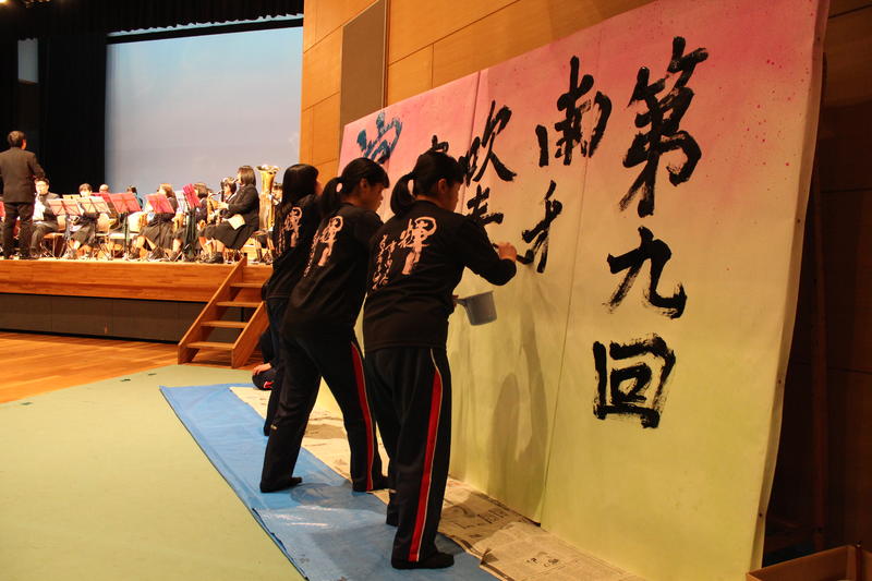 24日(月)の第9回吹奏楽部定期演奏会でのステージ発表本番に臨みました。14:00からのオープニングステージでの本番を控え、午前中から準備・リハーサルに余念がありませんでした。今日の出番を控えた書道部員一同は多少緊張や不安を見せる場面もありましたが、終始和やかに時折笑顔を見せながら本番までの時間を過ごしていました。