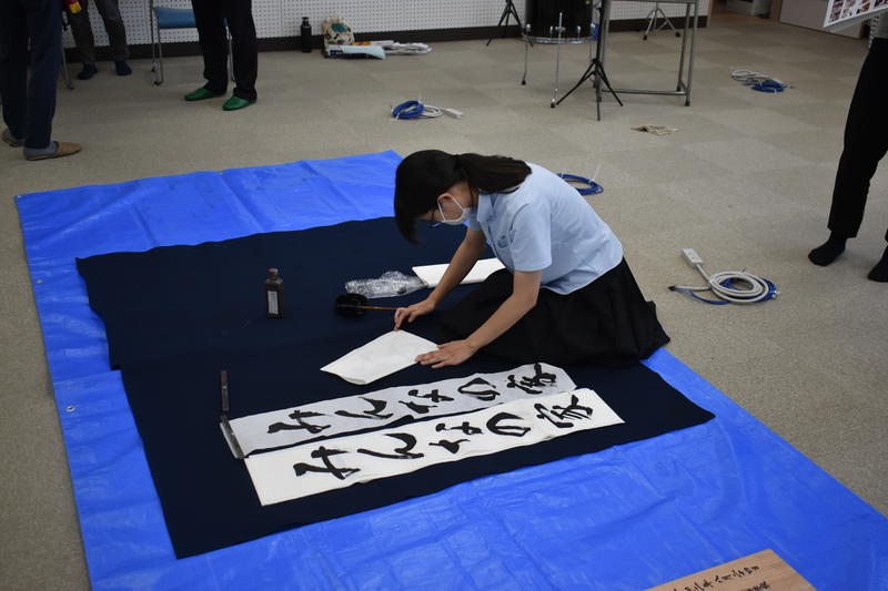 今回、表札看板に揮毫したのは、この看板が掲げられる山江村出身の書道部員谷口さん(3年総合農業科)です。3年生として進路活動に専念している合間を縫ってこの日のために練習を重ね、自分が住んでいる地域の仮設住宅に掲げられることもあり「山江村の被災された方々に元気を届けたい」という思いを一心に込めて看板に一文字ずつ丁寧にしたためていました。