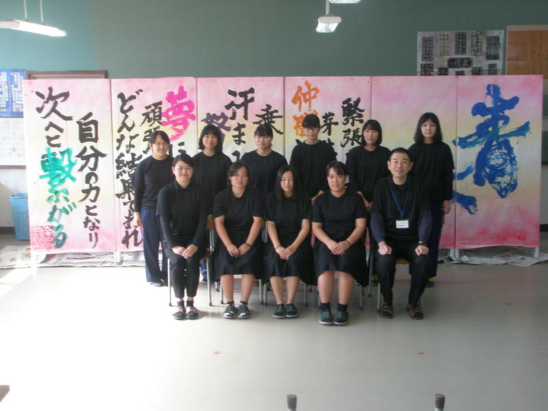 今日の本番を迎えるにあたり書道部一同練習を重ねて精一杯取り組んできました。無事に発表が終了し、昨年よりもパネルの大きさや揮毫する量も増え、発表が成功するのか不安でしたが発表終了直後の一同ホッとした様子が何とも印象的でした。終了後は作品を書道教室まで運び、卒業する3年生の先輩と一緒に作品をバックに卒業アルバム用の写真を撮影しました。