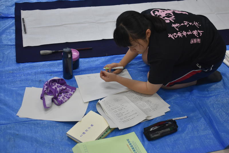 本校書道部員も当日の大会参加に向け、夏休みを中心に精一杯練習を重ねてきましたが、会場での揮毫が出来ずに気持ちを切り替えての作品制作となりました。そして、揮毫開始直前まで顧問の土肥先生の指導を受けて筆を運んでいました。