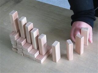 休憩時間には、ジェンガで実際に遊んでみました。ジェンガのルールで遊んでみたり、パーツを高く積み上げて競争してみたり、パーツを並べてドミノ倒しをしてみたりしながら、木のぬくもりを感じることができました。