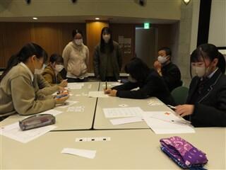グループワークでは、災害が起きた後、避難所に避難してきた人々であるという想定のもと、メンバー全員が不満なく食べ物を分けるための話し合いを体験しました。