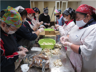 今回のボランティアは、地域の婦人会の方々と共に、地域の方々や災害ボランティアの方々のために昼食のカレーをつくってふるまうというものでした。大量の食材を洗って、切って・・気の遠くなるような作業でしたが、できあがったカレーに喜んでくださる人たちの笑顔で、疲れがふきとびました。