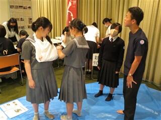 救急法体験コーナーでは、主に三角巾を使った腕の吊りと膝の手当、ハンカチを使った手の甲の手当、ストッキングを使った腕の吊りに絞って、来場者の皆さんにも体験していただきました。三角巾がなくても、ハンカチやストッキングなど身近な物を使って手当ができることは、来場者の方々にとって驚きだった様子でした。