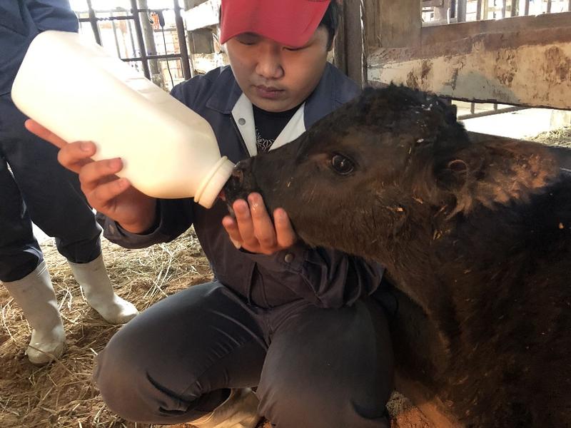子牛は哺乳ボトルでミルクを飲ませようとしてもなかなか、うまくいきません。強引にすると誤嚥(気管にミルクが入ること)してしまい、病気の原因になります。子牛がミルクを吸いたくなるような方法を考えながら取り組むことができました。