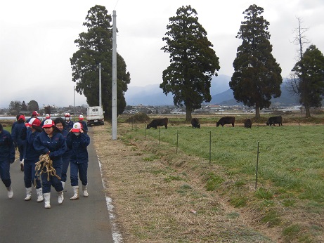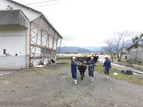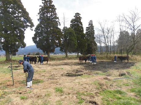 牛の引っ越し 投稿日時 : 2016/02/15 作成者1 1年生産科学科園芸科学科2組の授業では牛の引っ越しが行われました。本校では「牧草地を利用した繁殖牛の周年放牧」に挑戦しています。これまで放牧させていた牧草地はそろそろトウモロコシ栽培の準備をしなくてはならないため、学校敷地内の雑木林に移動させ、畑を空けます。先生が広い牧草地を指しながら「ここの牛、全部捕まえるぞ」と説明しています。意外にすんなり捕まえることができました。1年生は牛の扱いが上達してきましたね。生徒二人と一頭でお散歩です。「次のおうちはどこですか?」やっと、到着しました。この雑木林を中心に今後は放牧します。「おいしい、おいしい」隣の牧草地の草を食べられるようにしてあるから、エサは十分ですね。牛がちょっと離れた場所で生活するから心配です。「かわいい子には旅をさせよ」。牛にとっては快適に生活できる環境です。水の管理とともに時々、観察していきます。