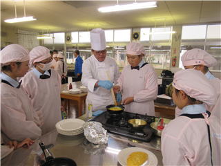 みらいの技能士育成ステップ事業☆西洋料理☆ 投稿日時 : 2019/12/17 投稿者5 12月17日(火)4、5、6限に生活経営科の2年生がみらいの技能士 育成ステップ事業で西洋料理(オムレツと飾り切り)について 学びました。 オムレツ作りでは菜箸やフライパンの動かし方を学び、飾り切りではにんじんを使った梅や大根の薄切りを 使って鶴を形作りました。オムレツも飾り切りも初めは「難しくて無理かも~」という声が生徒からありましたが、丁寧に教えていただき、作り上げることができました。お忙しいなか、教えていただきありがとうございました。