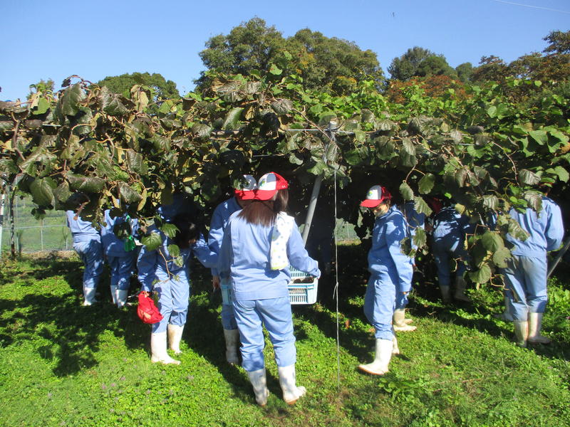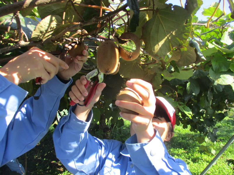 キウイフルーツの収穫【総合農業科2年植物コース】 投稿日時 : 2020/11/13 投稿者2 「果樹」の実習でキウイフルーツの収穫を行いました。果樹では、6月下旬のモモの収穫から始まり、7月~10月初旬ブドウ 8月ブルーベリー、10月クリを収穫しました。キウイフルーツは、ブドウと同じで台風に強い、栽培も容易で長期貯蔵ができるといった特性があります。また、美容やアンチエイジング効果があることなどからターゲットを絞った販売で需要の拡大が期待できるのではと新たな栽培品目としても検討しています。