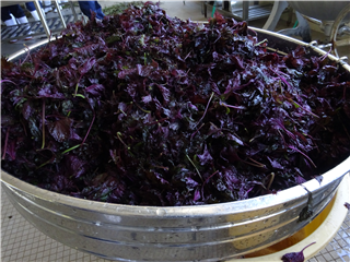 食品科学科1年:栽培したシソの抽出液作り! 投稿日時 : 2015/07/17 投稿者4 食品科学科1年生の「農業と環境」で栽培した赤シソの葉収穫し、その葉を一枚一枚枝から外し、紫蘇ジュースの原料となるシソの抽出液作りをしました。 10kgのシソの葉を二重釜で茹で、色素を抽出した抽出液を取り出します。 25人で40kgのシソの葉を処理することが出来ました。みんなで協力して、予定より30以上早く実習を終わらせることができました。 この後のジュース製造は、2年食品科学科の生徒が来週製造します。販売は、食品衛生検査の結果が出てからになります。しばらくお待ち下さい。