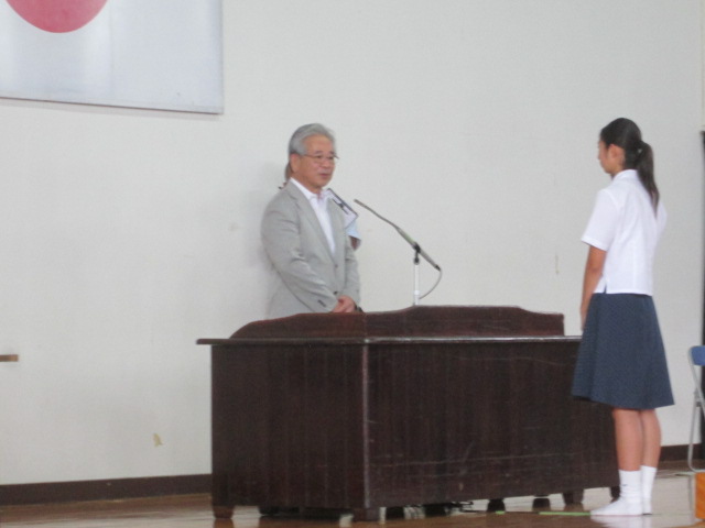 体育館では、鶴田会長から、鬼塚さんへ代表して渡していただき、式終了後、丸尾先生からそれぞれに交付しました。