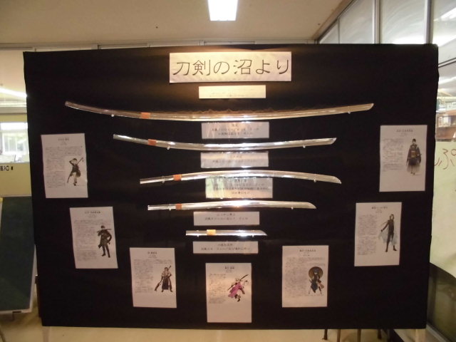 図書委員会の企画展示 投稿日時 : 2017/07/18 学校サイト管理者 図書館前のホールでは、図書委員企画の「七夕」がおわり、図書委員企画第二弾で「日本刀」の展示を行っています。図書委員長が模造刀を作り調べをまとめ展示しています。模造刀は大きさも反りも正確に表現しています。(材料は透明バインダー・アクリル棒・かぶせ・アルミテープ)熊本の刀(阿蘇の蛍丸・玉名の同田貫)を中心に展示。本も併せて展示中です。