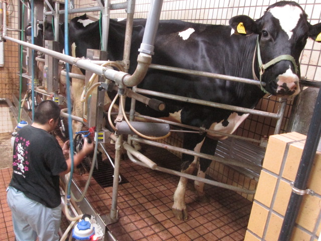 ・牛群検定 (2018/5/2) 投稿日時 : 2018/05/02 学校サイト管理者 ・牛群検定 (2018/5/2)5月2日(水)神殿原農場で、牛群検定を行いました。月に一度、検定員が搾乳作業に立会することで、乳量、乳成分の他、繁殖、飼料といった飼養管理情報を得て、経営改善に役立てる事業です。検定員の吉開さんに調査をしていただきました。乳牛一頭一頭からの乳をサンプルとして詰めていきます。