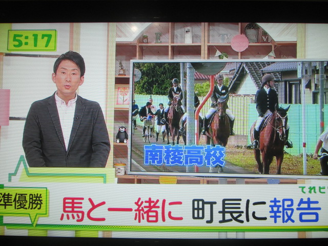 ・馬術部 準優勝 あさぎり町表敬KKT (2018/8/24) 投稿日時 : 2018/08/25 学校サイト管理者 ・馬術部 準優勝 あさぎり町表敬KKT (2018/8/24)8月24日(金)馬術部の表敬の様子がKKTニュースで放映されました。