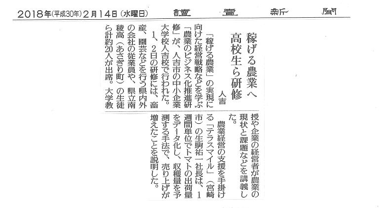 ・農業ビジネス化推進研修 新聞記事 (2018/2/15) 投稿日時 : 2018/02/15 学校サイト管理者 ・農業ビジネス化推進研修 新聞記事 (2018/2/15)2月1日(木)~2日(金)に、中小企業大学校人吉校で行われました「農業ビジネス化推進研修」が、2月14日(水)の読売新聞、2月9日(金)の人吉新聞に掲載されました。