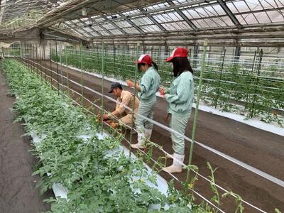 【総合農業科】スイカづくりは順調です! 投稿日時 : 2024/05/27 承認者 2年生の植物コースの実習風景です。中学生の皆さんは、特徴のあるこの葉の植物はわかりますか?これはスイカです。今日は、スイカの苗を垂直に伸ばすために、誘引しました。専用のテープを使いますが、無理をすると茎が折れてしまうので、注意が必要です。一つの株から一個のスイカができるのです!雌花には、赤いひもを巻いて印をつけます。