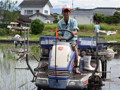 田植えパート2 投稿日時 : 2018/06/07 学校サイト管理者 6月7日、昨日に引き続き田植えを行いました。 丸尾先生より、優しくご指導を頂いています! 慣れてくると笑顔も見られました!振り返りながら何を話したのでしょうか?たぶん、曲がってしまったのではないでしょうか・・・(笑)。 苗箱が重いんです!!!しかし、笑顔で頑張ることができました!